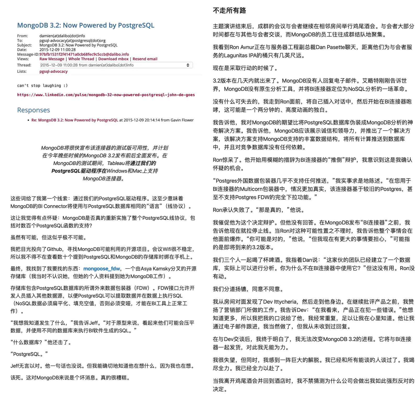 在所有关于 MongoDB 大忽悠的故事中,最让人印象深刻的是 LinkedIn 上的这篇《MongoDB 3.2 —— 现由 PostgreSQL 强力驱动》 。 这篇文章的精彩之处在于,它是由 MongoDB 合作伙伴发出的血泪控诉:MongoDB 无视了自己合作伙伴的忠言劝告,拿了一个 PostgreSQL 伪装成自己的分析引擎,并在发布会上忽悠用户。