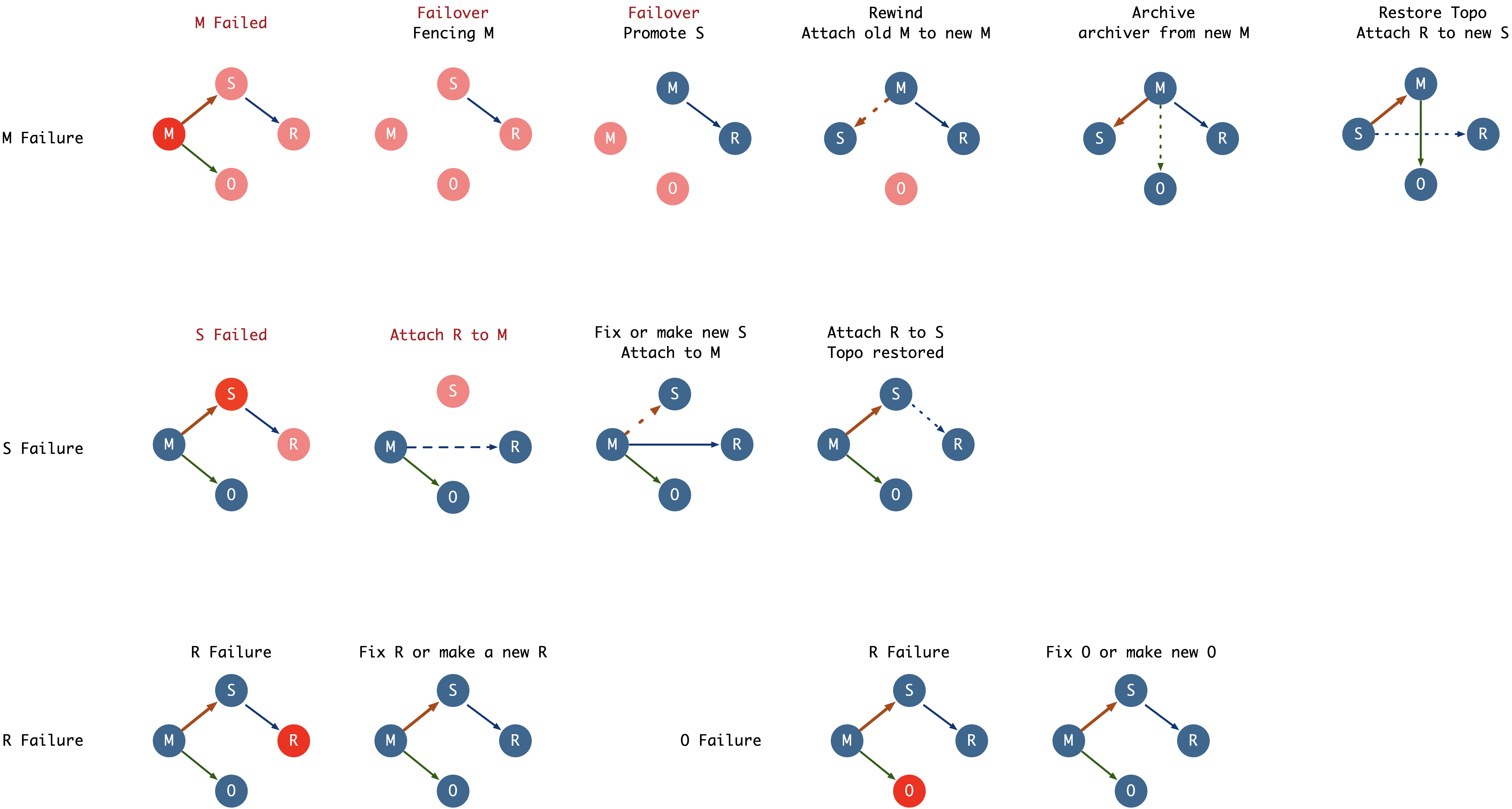 When M fails, it affects all components. Failover must be executed to promote S to the new M to restore the system as quickly as possible. Manual failover includes two steps: Fencing M (from heavy to light: shutdown, stop database, change HBA, close connection pool, pause connection pool) and Promote S. Both operations can be completed in a very short time through scripts. After failover, the system is basically restored. The original topology structure needs to be restored afterwards. For example, convert the original M to a new replica through pg_rewind, attach O to the new M, attach R to the new S; or after repairing M, return to the original topology through planned failover.
