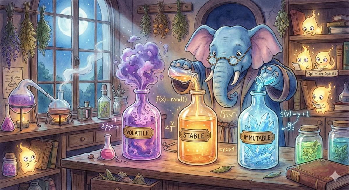 Each function carries a volatility level. Possible values include VOLATILE, STABLE, and IMMUTABLE. If no volatility level is specified when creating a function, it defaults to VOLATILE. Volatility is the function’s promise to the optimizer: