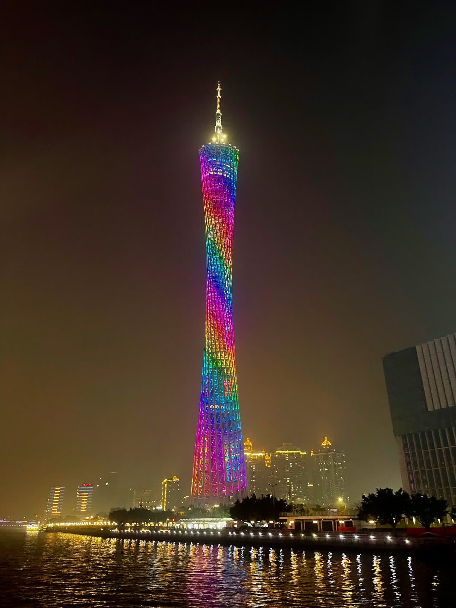 Passing Guangzhou Tower “Small Waist,” couldn’t avoid taking a tourist photo. Guangzhou Tower at night was flashy, with huge scrolling text including socialist core values - couldn’t help but criticize this aesthetic. Finally caught a shot when text finished scrolling.