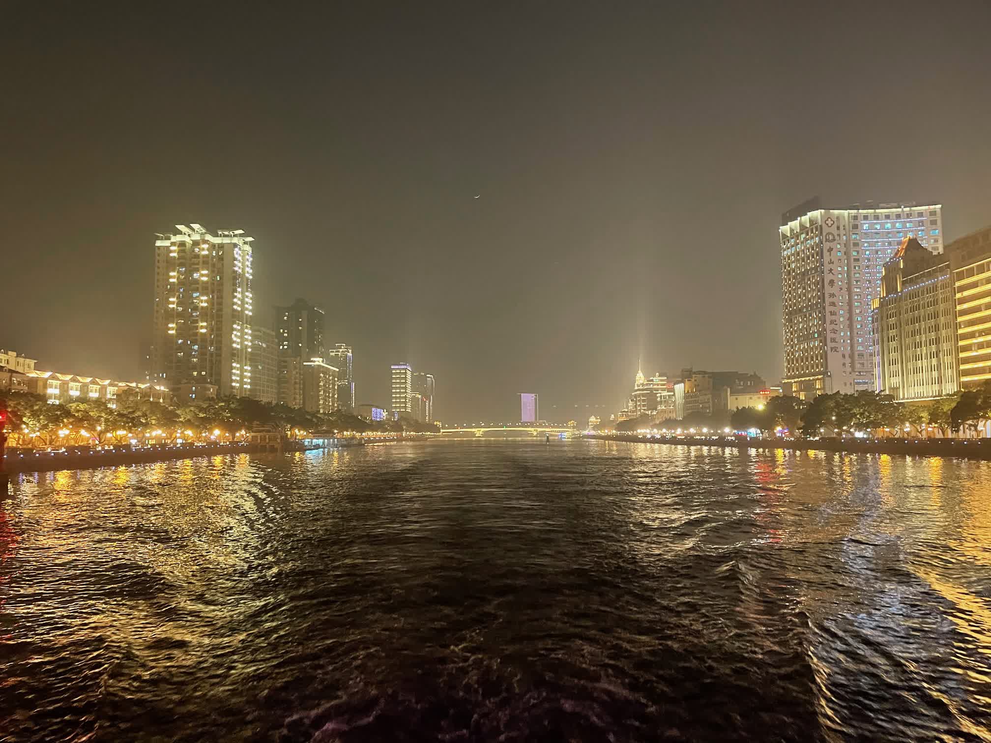 7:30 PM, I boarded the cruise right on time. The Pearl River under night sky was illuminated golden by lights from both banks.