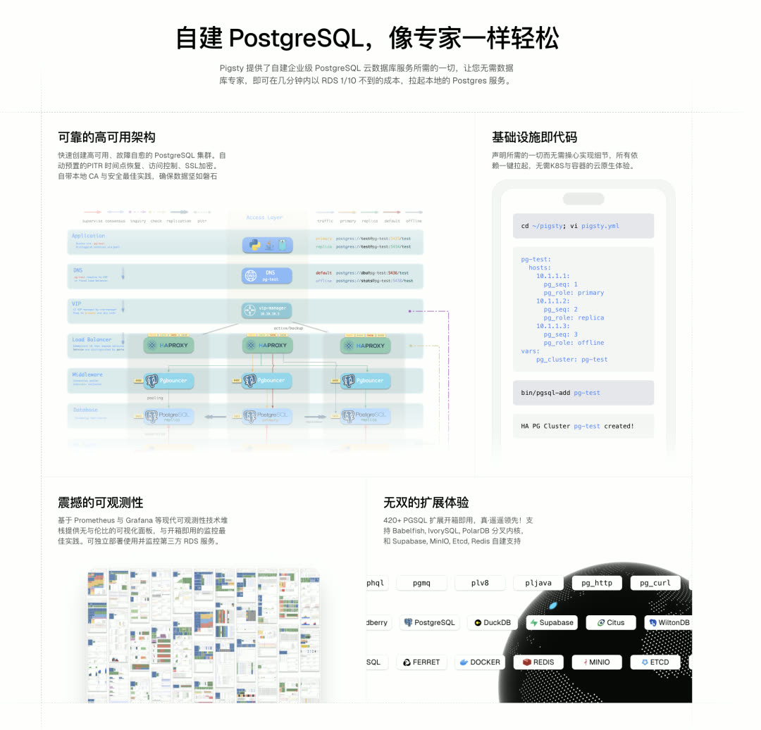 Pigsty 是一个开箱即用的 PostgreSQL 数据库发行版,可视为数据库的"自动驾驶软件"。它能让用户以云 RDS 十分之一不到的成本,在无需专业 DBA 的情况下,快速拉起企业级 PostgreSQL 数据库服务 —— 具备高可用、PITR、监控系统、IaC 能力,以及 421 个 PG 生态扩展插件,直接运行在 10 个主流 Linux 发行版上,无需容器或 Kubernetes。