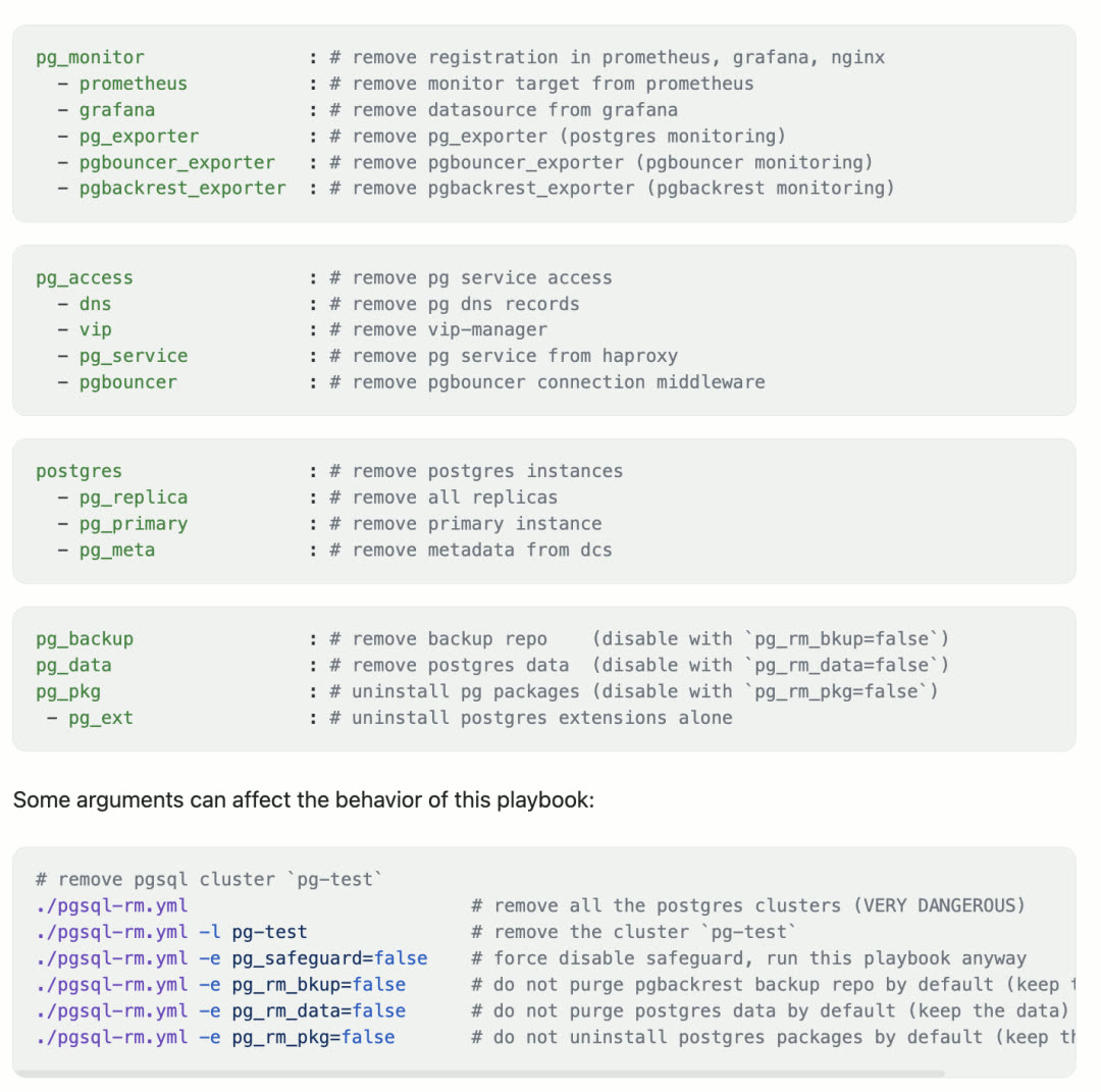 重要变更:彻底移除了 pgsql.yml 剧本的删库功能。从 v3.5 起,删库操作仅能通过 pgsql-rm.yml 专用剧本执行,不再需要各种"安全阀"和"保险栓"。