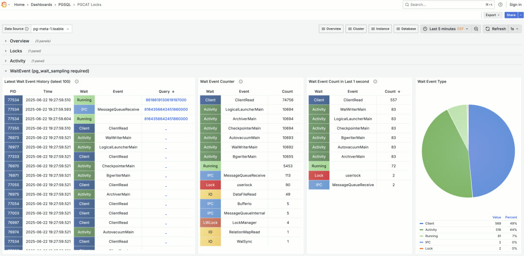PG 内核本身只提供当前活动的等待状态,但没有历史等待事件记录。这只能通过插件实现 —— pg_wait_samplingpgsentinel 都提供了此功能,监控面板也已支持等待事件分析。