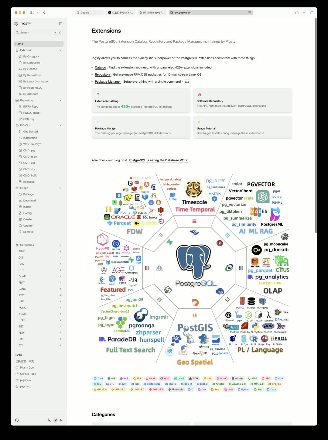 扩展目录站点也已全面翻新,采用 Next.js 重构,观感大幅提升,新地址:https://pgext.cloud