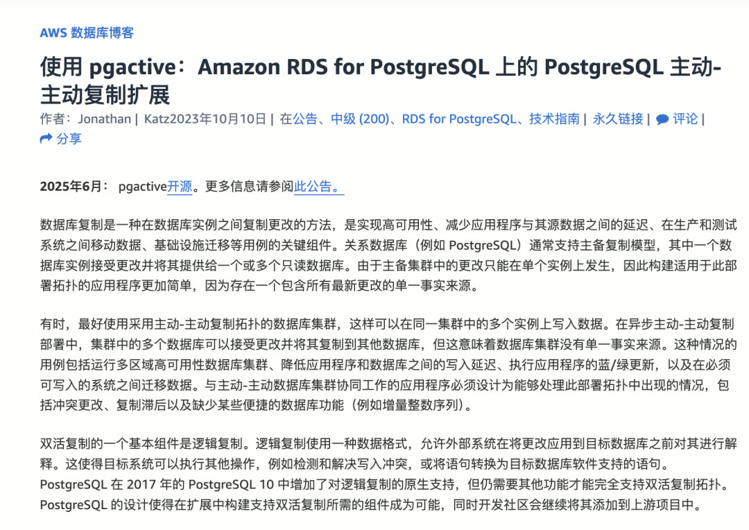 另一个值得关注的扩展是 pgactive —— 由 AWS 开发并开源的 PG 多活扩展,声称解决了亚秒级高可用切换问题。该扩展依赖缺失的 pgfeutils,编译有一定门槛,Pigsty 已提供开箱即用的二进制包。