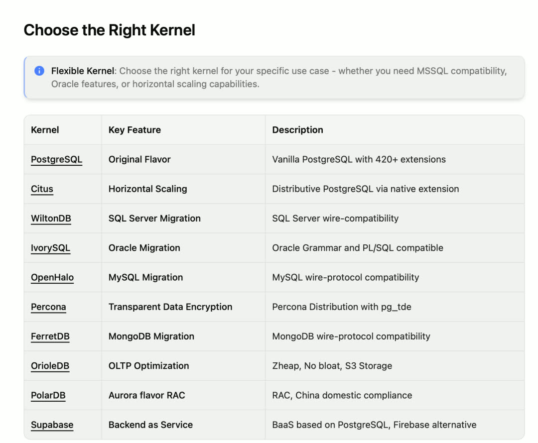 至此,Pigsty 支持的 PostgreSQL 内核数量已达到 10 个。