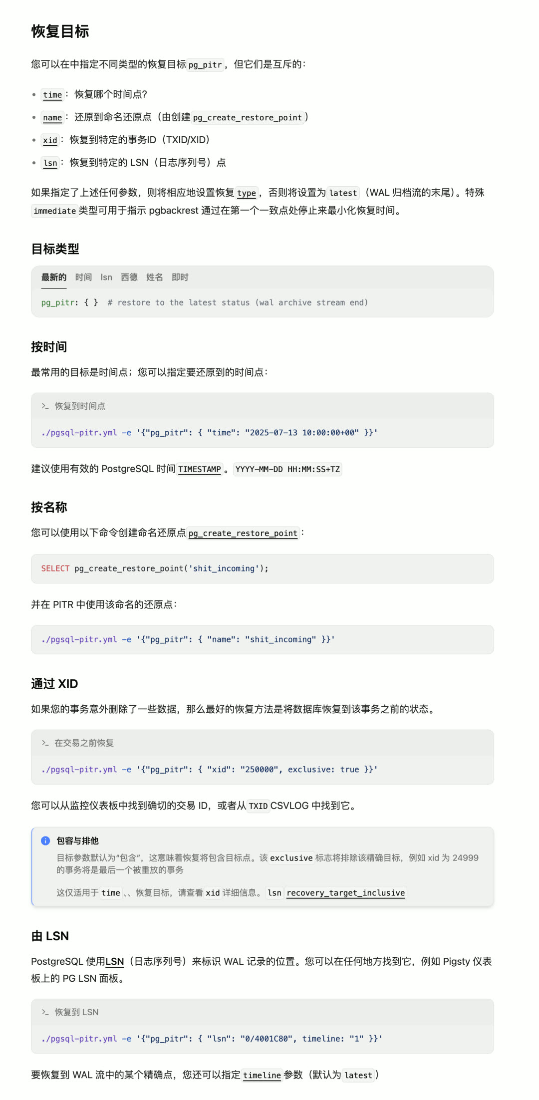 - 生成并执行 pgbackrest PITR 恢复命令至指定目标位点